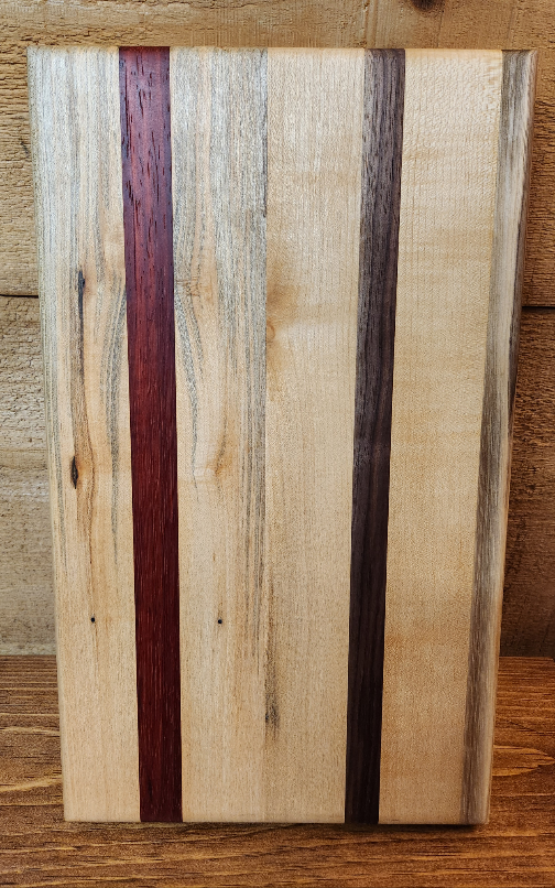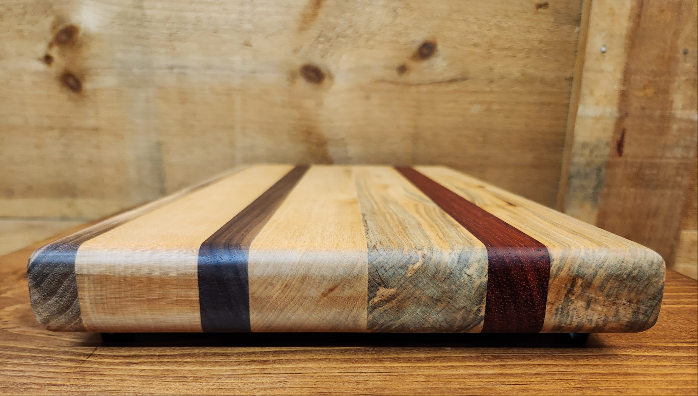 Our boards foundation is made of high-quality locally milled Walnut and maple that is expertly arranged in an edge grain pattern. We've added in gorgeous highlights of fiery Padouk to add a WOW factor to the board. The result is not just a durable cutting surface but a work of art that adds a touch of sophistication to your kitchen decor. The contrasting tones create a visually stunning pattern that is as eye-catching as it is functional.